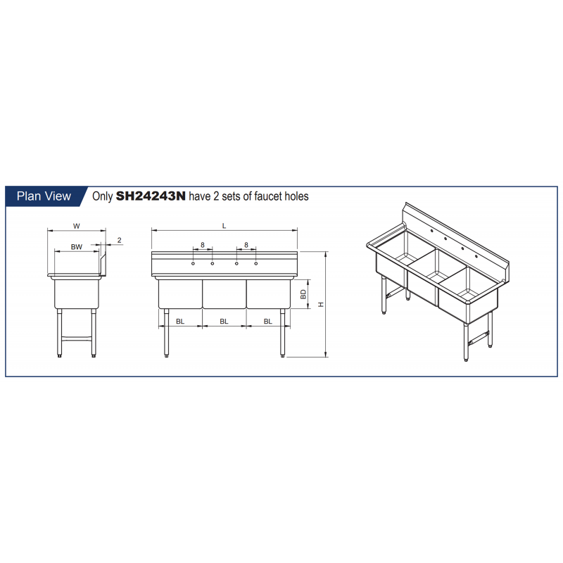 SH24243L - 3 Compartment Sink - Left Drain Board